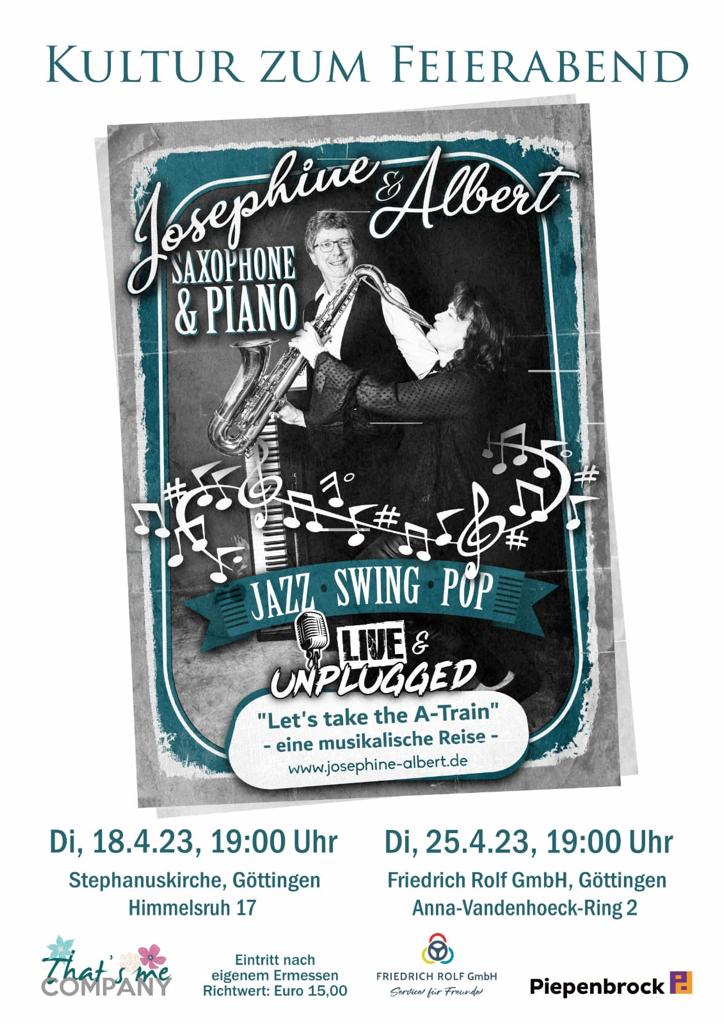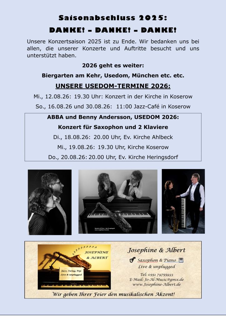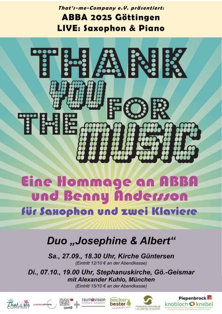 Montag, 16.01.23, 15:30 Uhr: GdA Wohnstift, Charlottenburger Str. 19, Göttingen (öffentliche Veranstaltung im Konzertsaal): „ABBA & Benny Andersson: Eine musikalische Hommage mit Saxophon und Piano“ mit Josephine am Altsaxophon und Albert am Konzertflügel